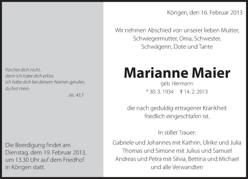 Hier finden Sie alle Traueranzeigen aus der Zeitung, die bisher für Marianne Maier erschienen sind. Weitere Traueranzeigen, die in der Zeitung erscheinen, werden hier ebenfalls aufgelistet