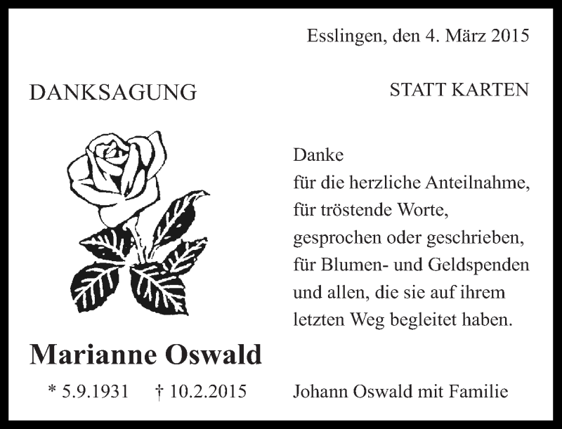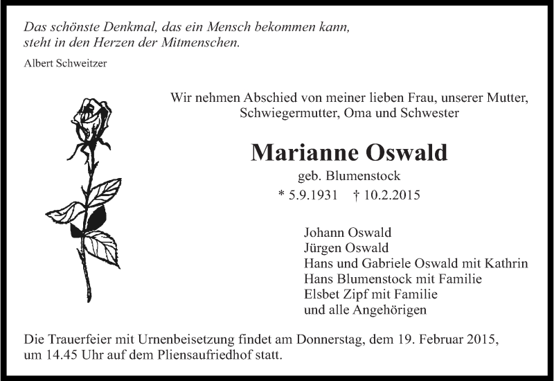 Hier finden Sie alle Traueranzeigen aus der Zeitung, die bisher für Marianne Oswald erschienen sind. Weitere Traueranzeigen, die in der Zeitung erscheinen, werden hier ebenfalls aufgelistet