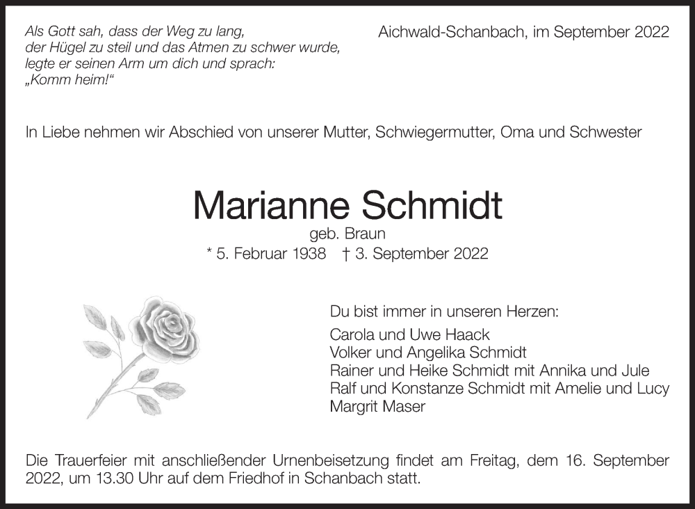 Hier finden Sie alle Traueranzeigen aus der Zeitung, die bisher für Marianne Schmidt erschienen sind. Weitere Traueranzeigen, die in der Zeitung erscheinen, werden hier ebenfalls aufgelistet