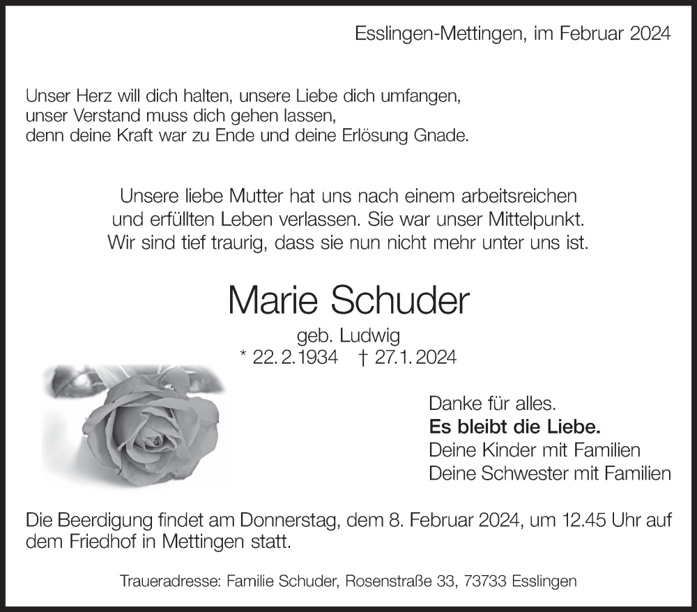 Hier finden Sie alle Traueranzeigen aus der Zeitung, die bisher für Marie Schuder erschienen sind. Weitere Traueranzeigen, die in der Zeitung erscheinen, werden hier ebenfalls aufgelistet