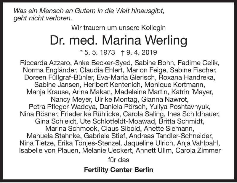 Hier finden Sie alle Traueranzeigen aus der Zeitung, die bisher für Marina Werling erschienen sind. Weitere Traueranzeigen, die in der Zeitung erscheinen, werden hier ebenfalls aufgelistet