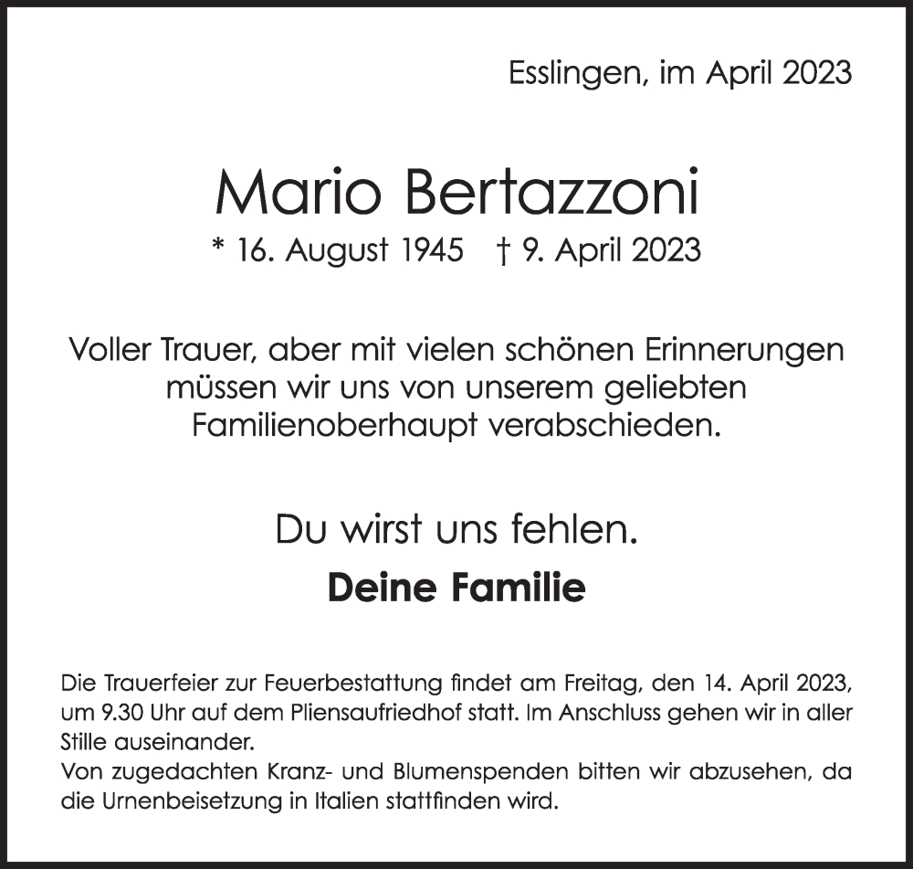 Hier finden Sie alle Traueranzeigen aus der Zeitung, die bisher für Mario Bertazzoni erschienen sind. Weitere Traueranzeigen, die in der Zeitung erscheinen, werden hier ebenfalls aufgelistet