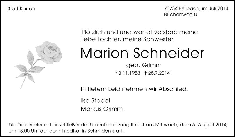 Hier finden Sie alle Traueranzeigen aus der Zeitung, die bisher für Marion Schneider erschienen sind. Weitere Traueranzeigen, die in der Zeitung erscheinen, werden hier ebenfalls aufgelistet