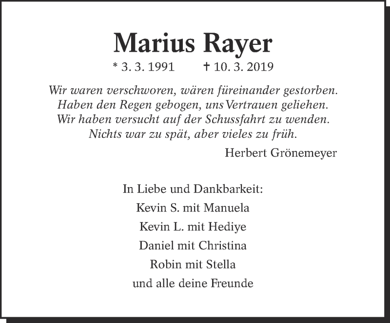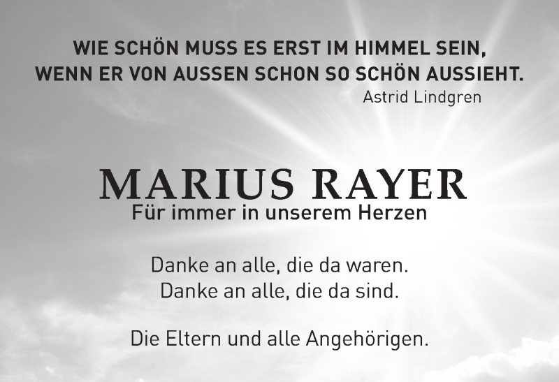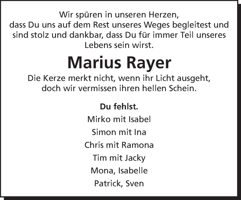 Hier finden Sie alle Traueranzeigen aus der Zeitung, die bisher für Marius Rayer erschienen sind. Weitere Traueranzeigen, die in der Zeitung erscheinen, werden hier ebenfalls aufgelistet