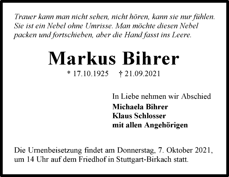 Hier finden Sie alle Traueranzeigen aus der Zeitung, die bisher für Markus Bihrer erschienen sind. Weitere Traueranzeigen, die in der Zeitung erscheinen, werden hier ebenfalls aufgelistet