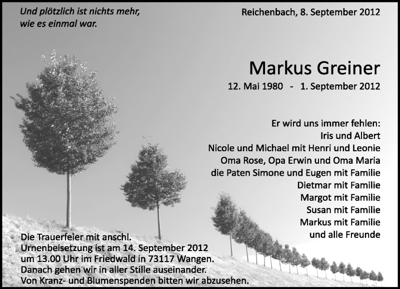 Hier finden Sie alle Traueranzeigen aus der Zeitung, die bisher für Markus Greiner erschienen sind. Weitere Traueranzeigen, die in der Zeitung erscheinen, werden hier ebenfalls aufgelistet