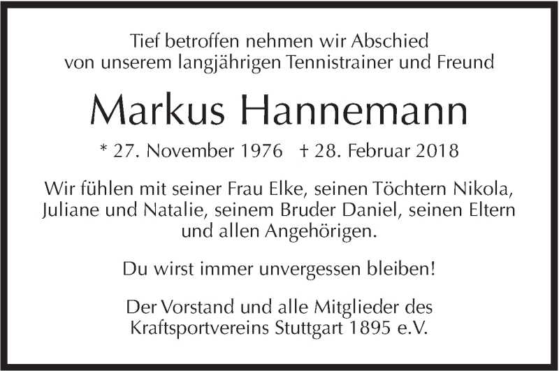 Hier finden Sie alle Traueranzeigen aus der Zeitung, die bisher für Markus Hannemann erschienen sind. Weitere Traueranzeigen, die in der Zeitung erscheinen, werden hier ebenfalls aufgelistet