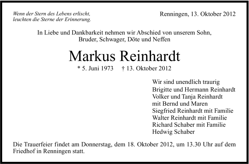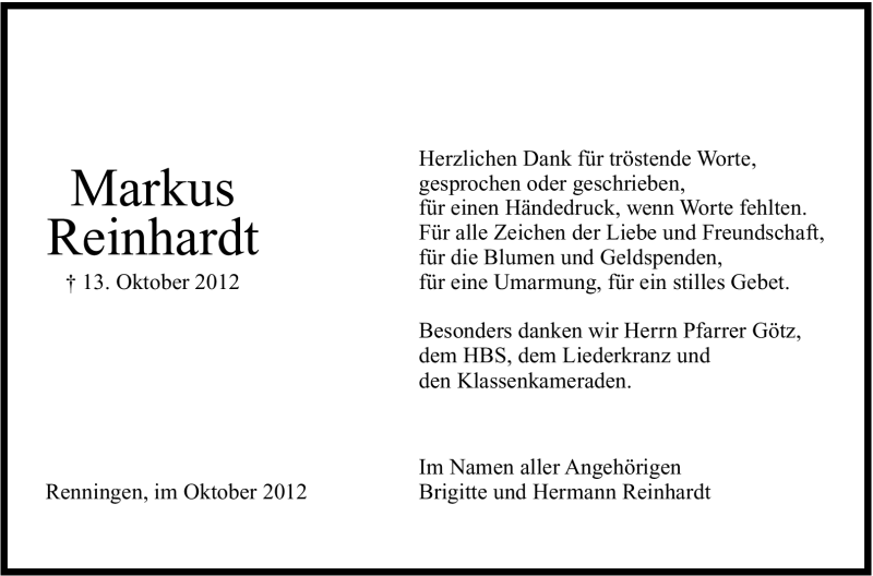 Hier finden Sie alle Traueranzeigen aus der Zeitung, die bisher für Markus Reinhardt erschienen sind. Weitere Traueranzeigen, die in der Zeitung erscheinen, werden hier ebenfalls aufgelistet