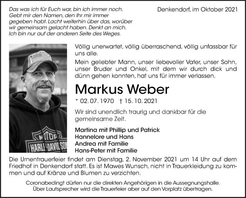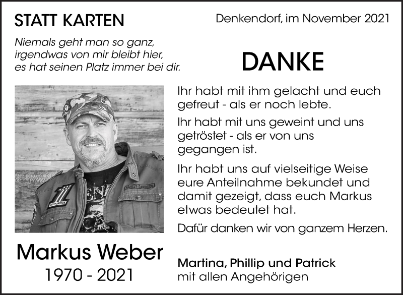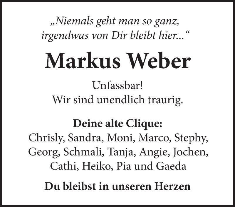 Hier finden Sie alle Traueranzeigen aus der Zeitung, die bisher für Markus Weber erschienen sind. Weitere Traueranzeigen, die in der Zeitung erscheinen, werden hier ebenfalls aufgelistet
