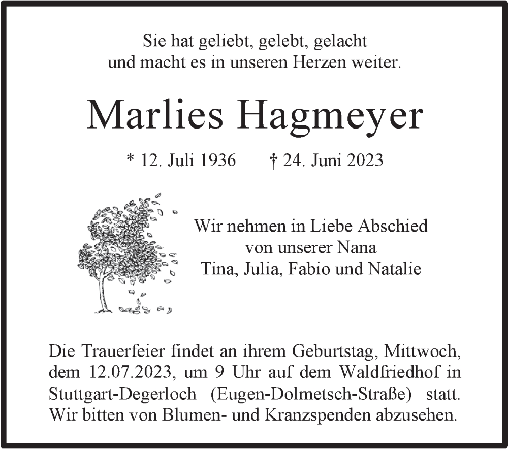 Hier finden Sie alle Traueranzeigen aus der Zeitung, die bisher für Marlies Hagmeyer erschienen sind. Weitere Traueranzeigen, die in der Zeitung erscheinen, werden hier ebenfalls aufgelistet
