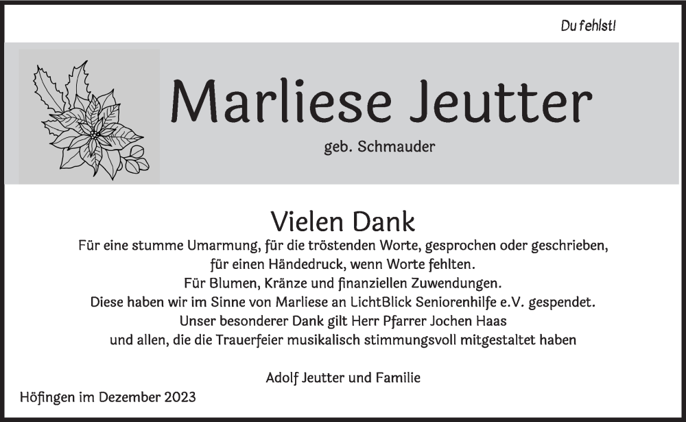 Hier finden Sie alle Traueranzeigen aus der Zeitung, die bisher für Marliese Jeutter erschienen sind. Weitere Traueranzeigen, die in der Zeitung erscheinen, werden hier ebenfalls aufgelistet