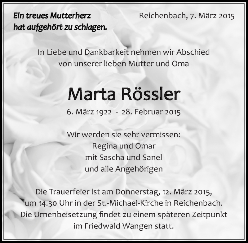 Hier finden Sie alle Traueranzeigen aus der Zeitung, die bisher für Marta Rössler erschienen sind. Weitere Traueranzeigen, die in der Zeitung erscheinen, werden hier ebenfalls aufgelistet