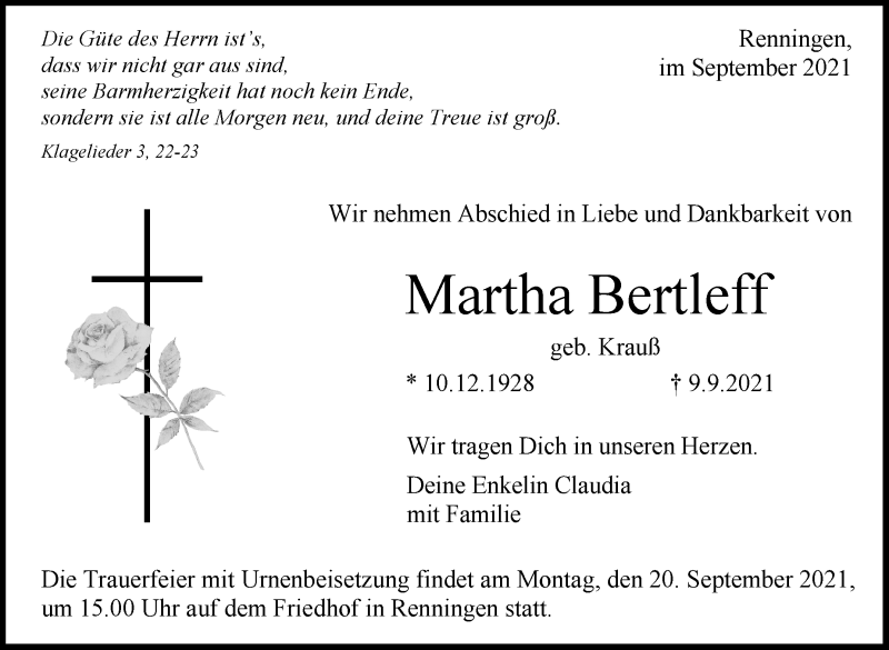 Hier finden Sie alle Traueranzeigen aus der Zeitung, die bisher für Martha Bertleff erschienen sind. Weitere Traueranzeigen, die in der Zeitung erscheinen, werden hier ebenfalls aufgelistet