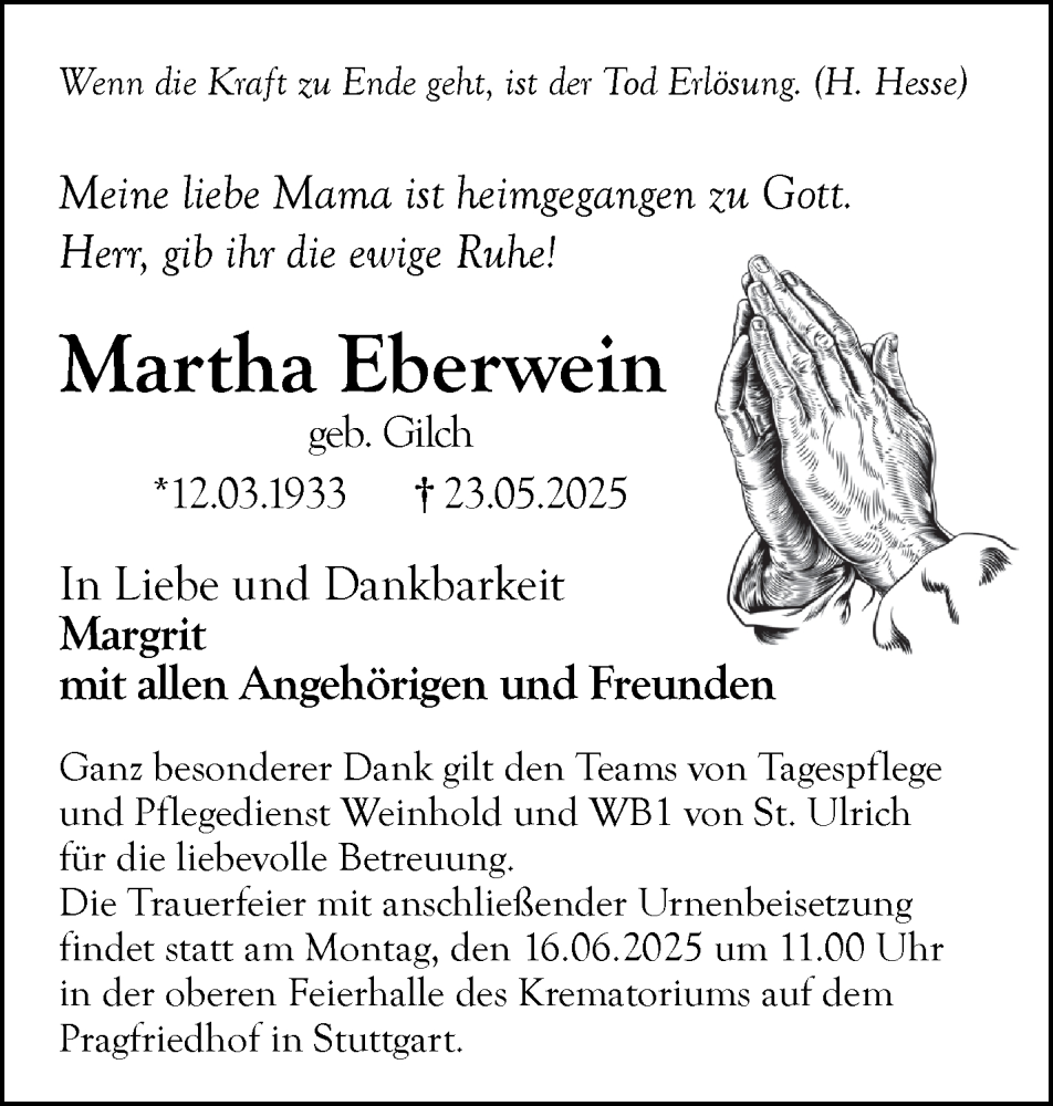 Hier finden Sie alle Traueranzeigen aus der Zeitung, die bisher für Martha Eberwein erschienen sind. Weitere Traueranzeigen, die in der Zeitung erscheinen, werden hier ebenfalls aufgelistet