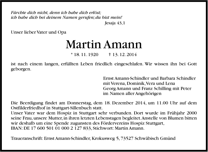 Hier finden Sie alle Traueranzeigen aus der Zeitung, die bisher für Martin Amann erschienen sind. Weitere Traueranzeigen, die in der Zeitung erscheinen, werden hier ebenfalls aufgelistet