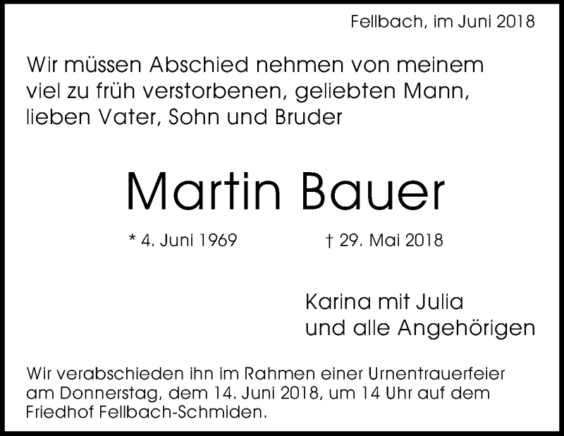Hier finden Sie alle Traueranzeigen aus der Zeitung, die bisher für Martin Bauer erschienen sind. Weitere Traueranzeigen, die in der Zeitung erscheinen, werden hier ebenfalls aufgelistet