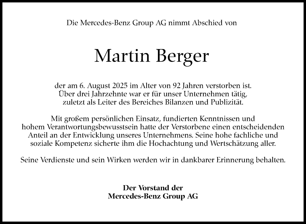 Hier finden Sie alle Traueranzeigen aus der Zeitung, die bisher für Martin Berger erschienen sind. Weitere Traueranzeigen, die in der Zeitung erscheinen, werden hier ebenfalls aufgelistet