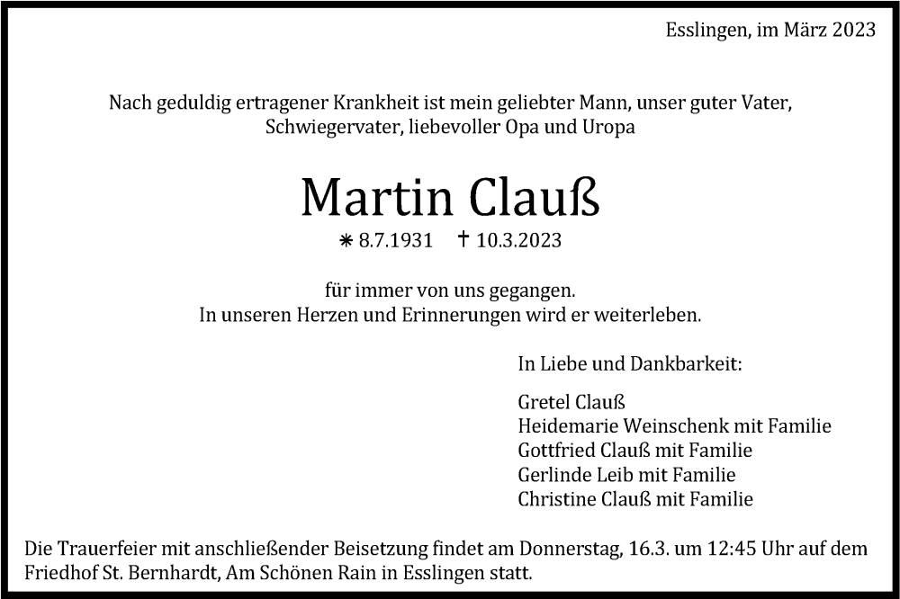 Hier finden Sie alle Traueranzeigen aus der Zeitung, die bisher für Martin Clauß erschienen sind. Weitere Traueranzeigen, die in der Zeitung erscheinen, werden hier ebenfalls aufgelistet