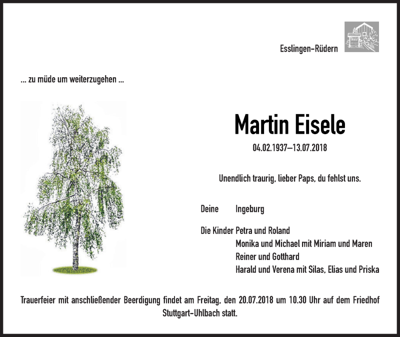 Hier finden Sie alle Traueranzeigen aus der Zeitung, die bisher für Martin Eisele erschienen sind. Weitere Traueranzeigen, die in der Zeitung erscheinen, werden hier ebenfalls aufgelistet
