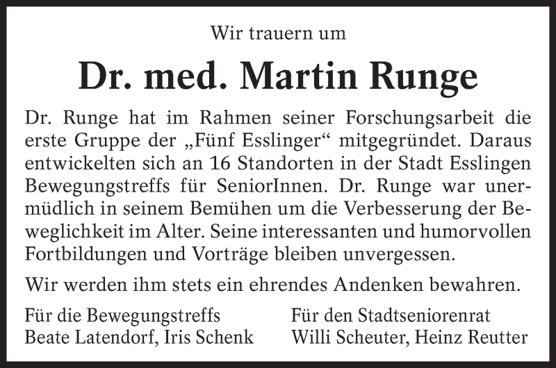 Hier finden Sie alle Traueranzeigen aus der Zeitung, die bisher für Martin Runge erschienen sind. Weitere Traueranzeigen, die in der Zeitung erscheinen, werden hier ebenfalls aufgelistet