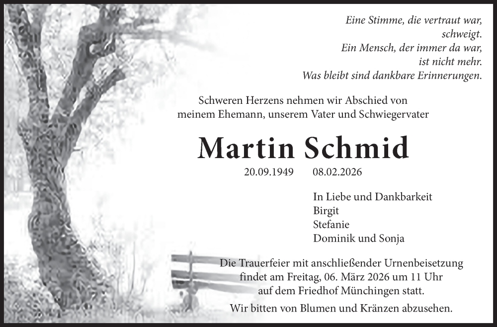 Hier finden Sie alle Traueranzeigen aus der Zeitung, die bisher für Martin Schmid erschienen sind. Weitere Traueranzeigen, die in der Zeitung erscheinen, werden hier ebenfalls aufgelistet