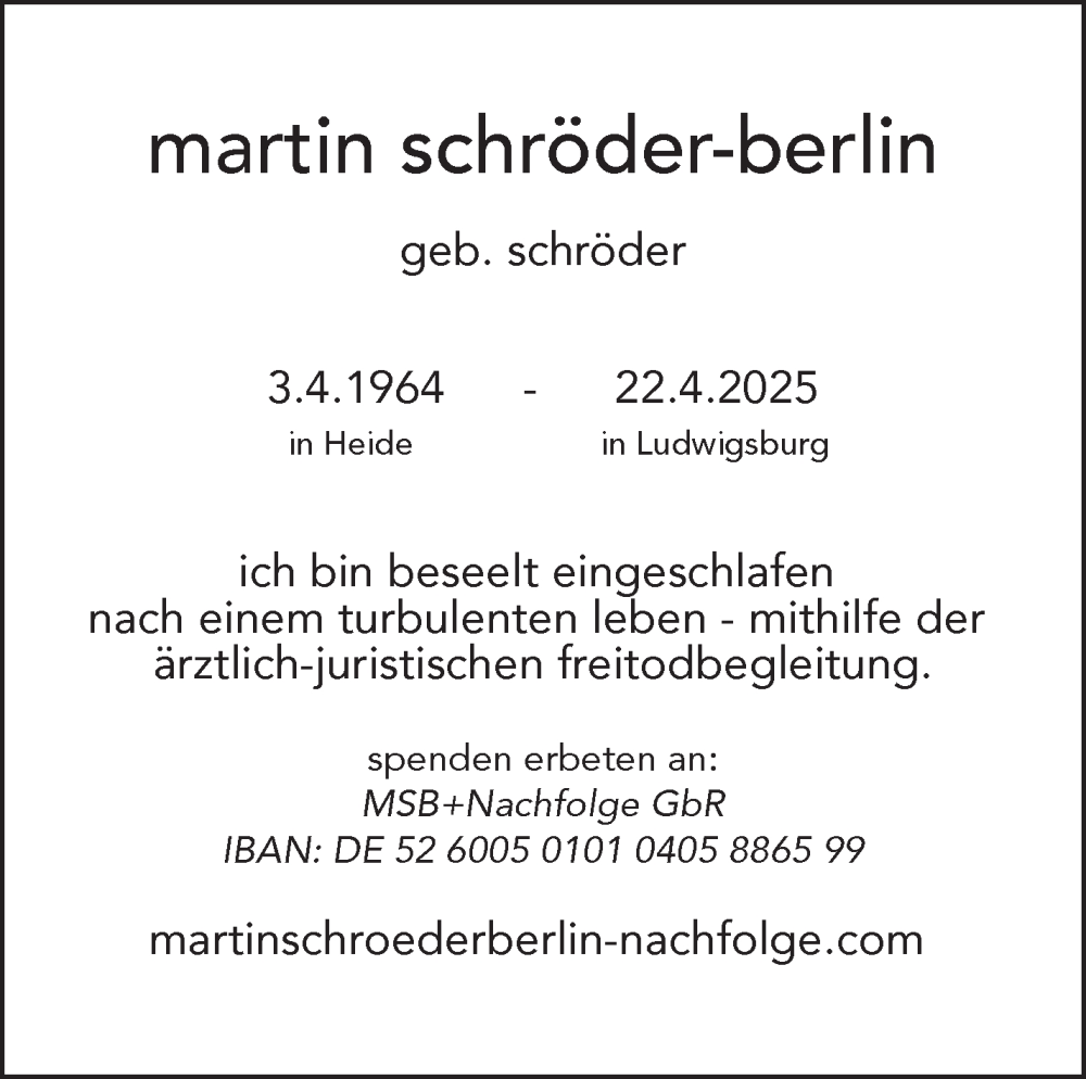 Hier finden Sie alle Traueranzeigen aus der Zeitung, die bisher für Martin Schröder-Berlin erschienen sind. Weitere Traueranzeigen, die in der Zeitung erscheinen, werden hier ebenfalls aufgelistet