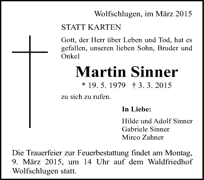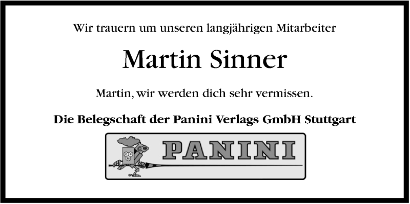Hier finden Sie alle Traueranzeigen aus der Zeitung, die bisher für Martin Sinner erschienen sind. Weitere Traueranzeigen, die in der Zeitung erscheinen, werden hier ebenfalls aufgelistet