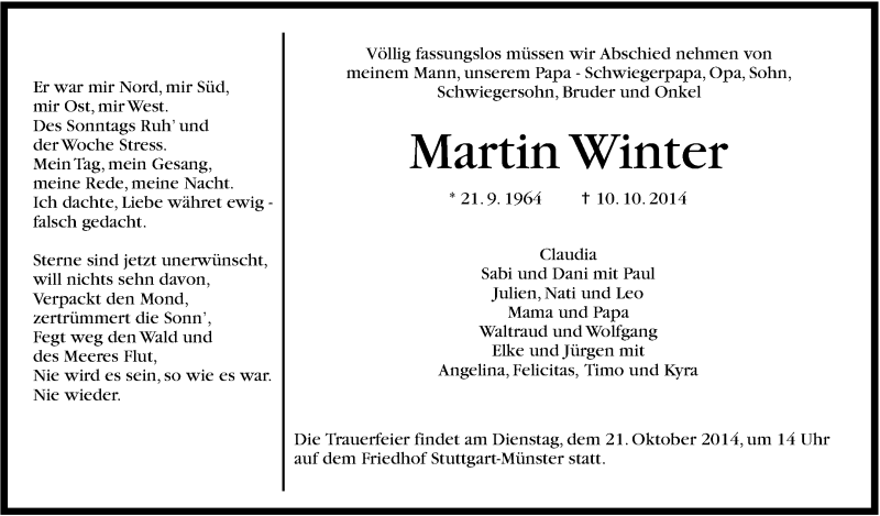 Hier finden Sie alle Traueranzeigen aus der Zeitung, die bisher für Martin Winter erschienen sind. Weitere Traueranzeigen, die in der Zeitung erscheinen, werden hier ebenfalls aufgelistet
