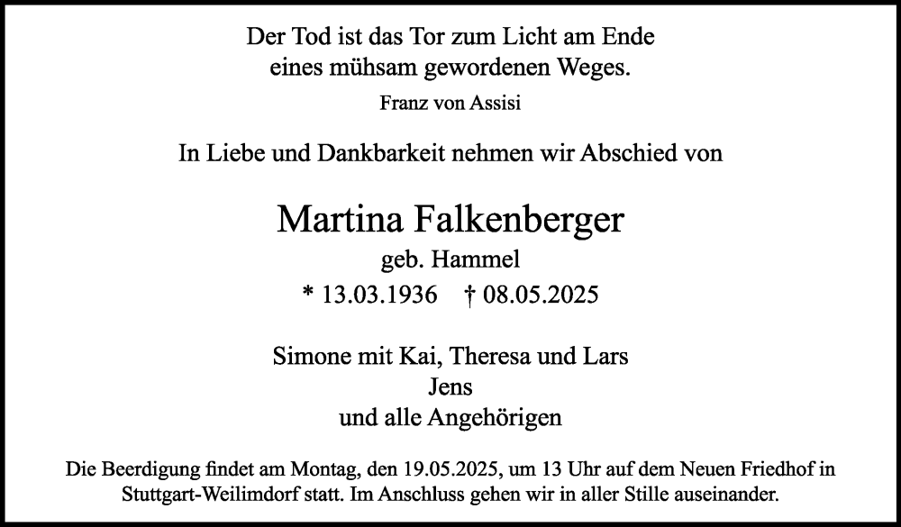 Hier finden Sie alle Traueranzeigen aus der Zeitung, die bisher für Martina Falkenberger erschienen sind. Weitere Traueranzeigen, die in der Zeitung erscheinen, werden hier ebenfalls aufgelistet