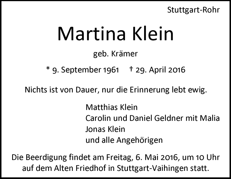 Hier finden Sie alle Traueranzeigen aus der Zeitung, die bisher für Martina Klein erschienen sind. Weitere Traueranzeigen, die in der Zeitung erscheinen, werden hier ebenfalls aufgelistet