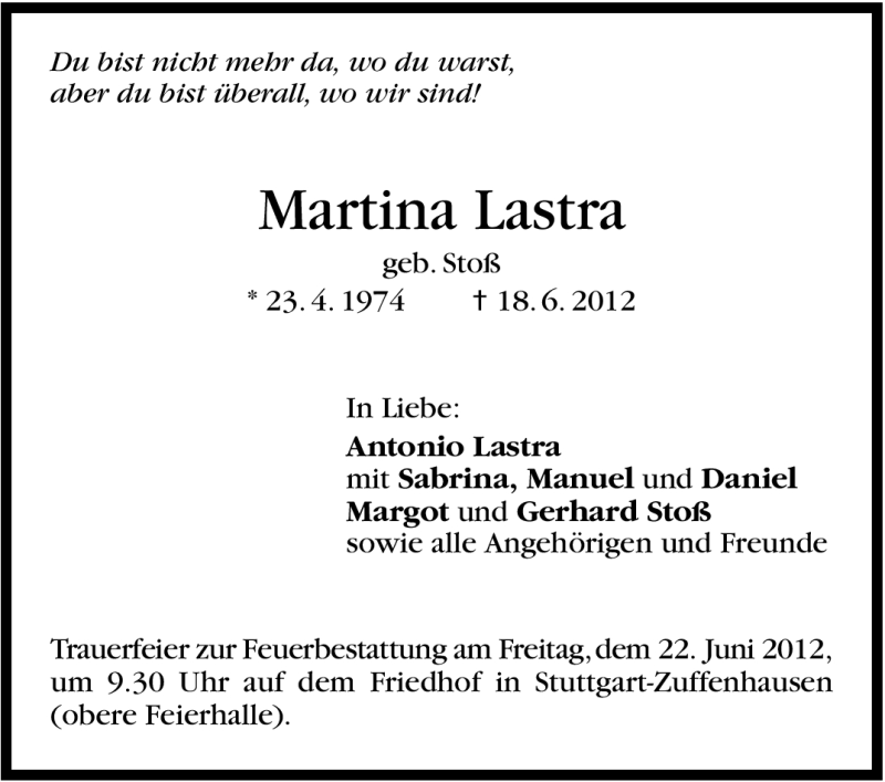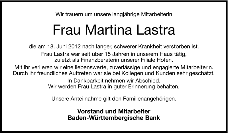 Hier finden Sie alle Traueranzeigen aus der Zeitung, die bisher für Martina Lastra erschienen sind. Weitere Traueranzeigen, die in der Zeitung erscheinen, werden hier ebenfalls aufgelistet