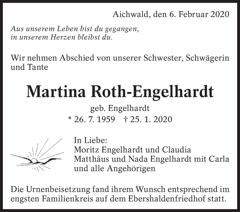 Hier finden Sie alle Traueranzeigen aus der Zeitung, die bisher für Martina Roth-Engelhardt erschienen sind. Weitere Traueranzeigen, die in der Zeitung erscheinen, werden hier ebenfalls aufgelistet