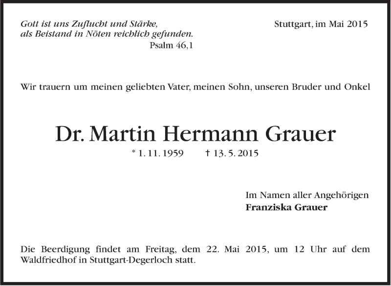 Hier finden Sie alle Traueranzeigen aus der Zeitung, die bisher für Martin Hermann Grauer erschienen sind. Weitere Traueranzeigen, die in der Zeitung erscheinen, werden hier ebenfalls aufgelistet