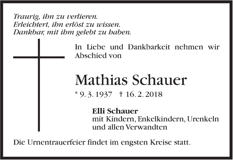 Hier finden Sie alle Traueranzeigen aus der Zeitung, die bisher für Mathias Schauer erschienen sind. Weitere Traueranzeigen, die in der Zeitung erscheinen, werden hier ebenfalls aufgelistet