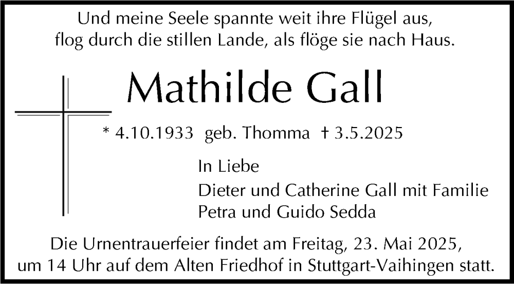 Hier finden Sie alle Traueranzeigen aus der Zeitung, die bisher für Mathilde Gall erschienen sind. Weitere Traueranzeigen, die in der Zeitung erscheinen, werden hier ebenfalls aufgelistet