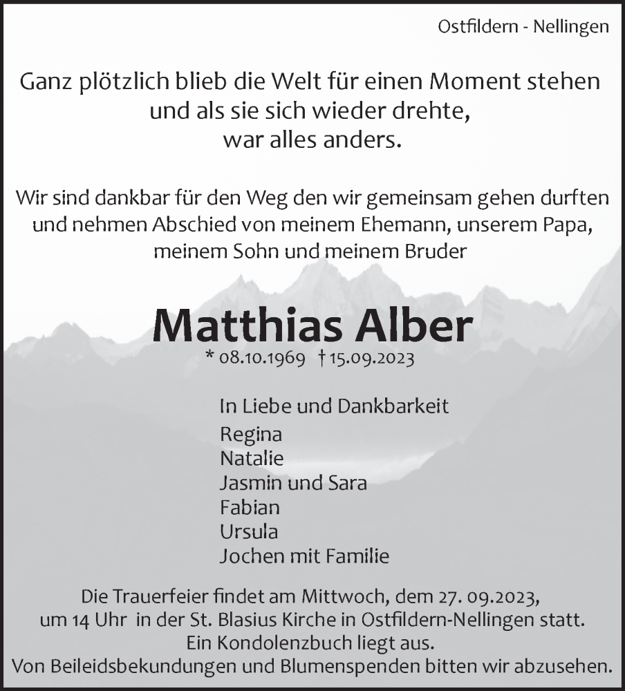 Hier finden Sie alle Traueranzeigen aus der Zeitung, die bisher für Matthias Alber erschienen sind. Weitere Traueranzeigen, die in der Zeitung erscheinen, werden hier ebenfalls aufgelistet