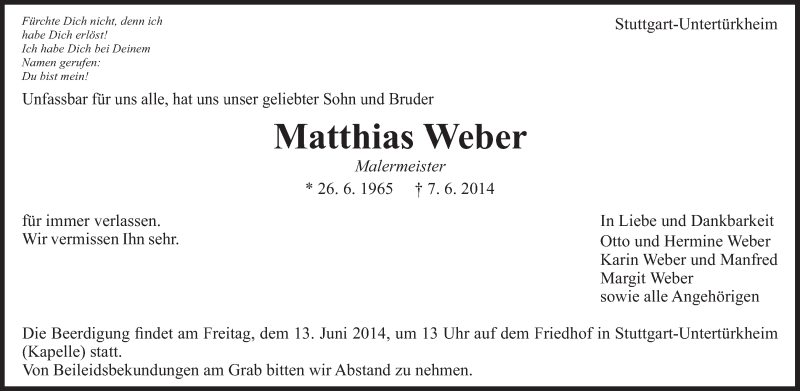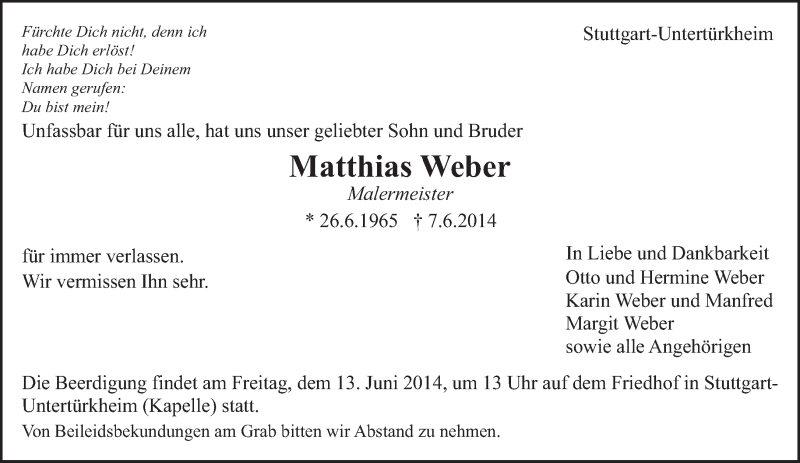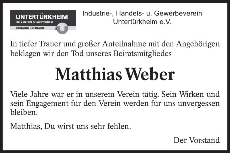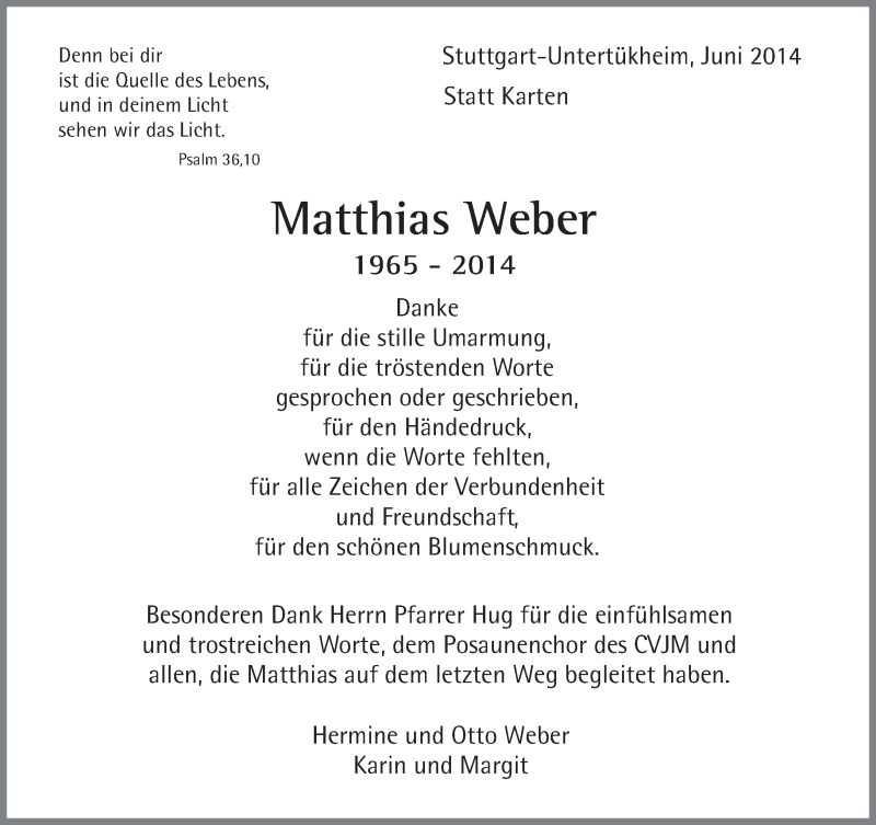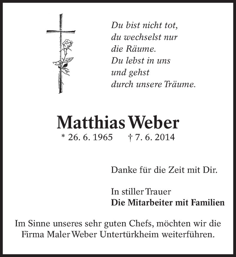 Hier finden Sie alle Traueranzeigen aus der Zeitung, die bisher für Matthias Weber erschienen sind. Weitere Traueranzeigen, die in der Zeitung erscheinen, werden hier ebenfalls aufgelistet