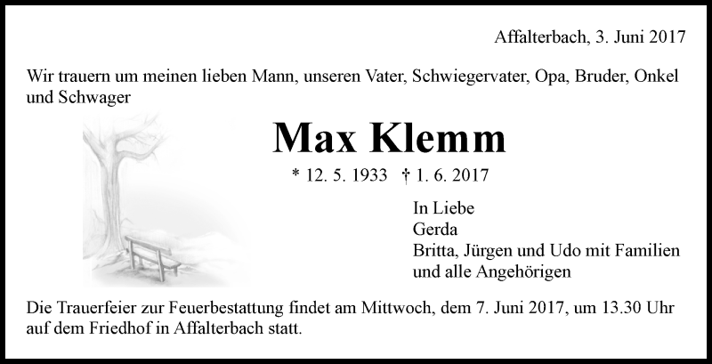 Hier finden Sie alle Traueranzeigen aus der Zeitung, die bisher für Max Klemm erschienen sind. Weitere Traueranzeigen, die in der Zeitung erscheinen, werden hier ebenfalls aufgelistet