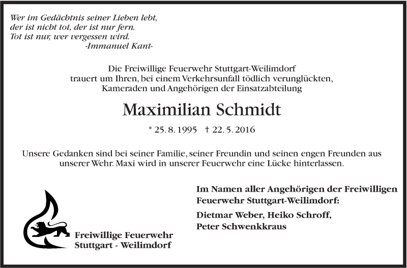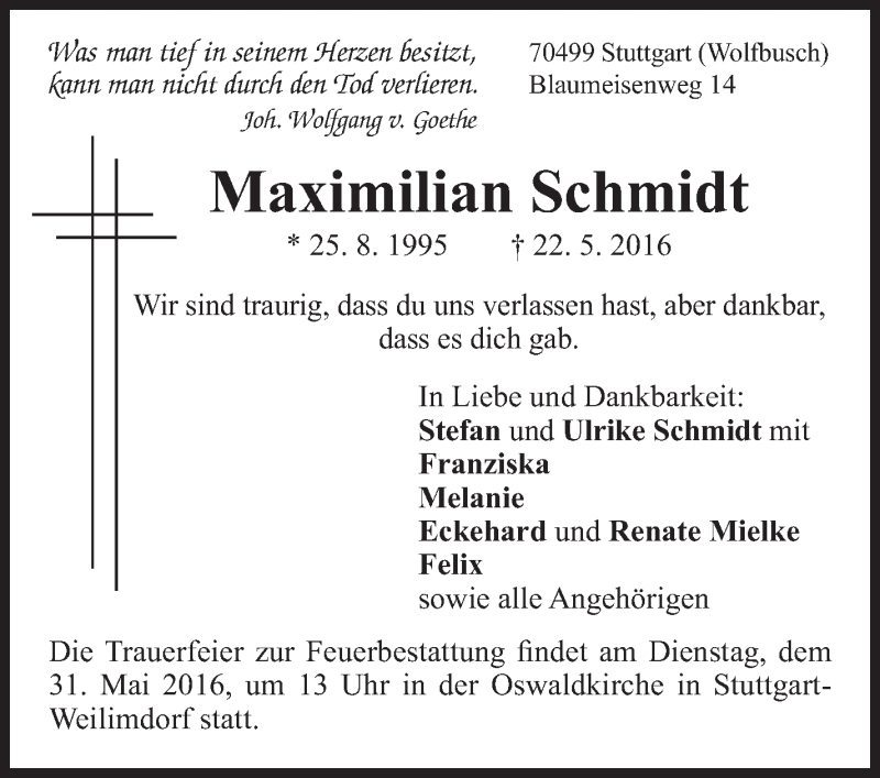 Hier finden Sie alle Traueranzeigen aus der Zeitung, die bisher für Maximilian Schmidt erschienen sind. Weitere Traueranzeigen, die in der Zeitung erscheinen, werden hier ebenfalls aufgelistet