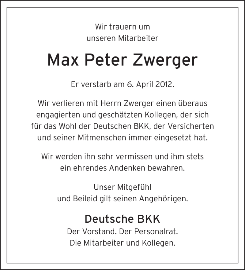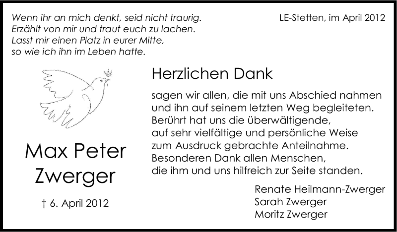 Hier finden Sie alle Traueranzeigen aus der Zeitung, die bisher für Max Peter Zwerger erschienen sind. Weitere Traueranzeigen, die in der Zeitung erscheinen, werden hier ebenfalls aufgelistet