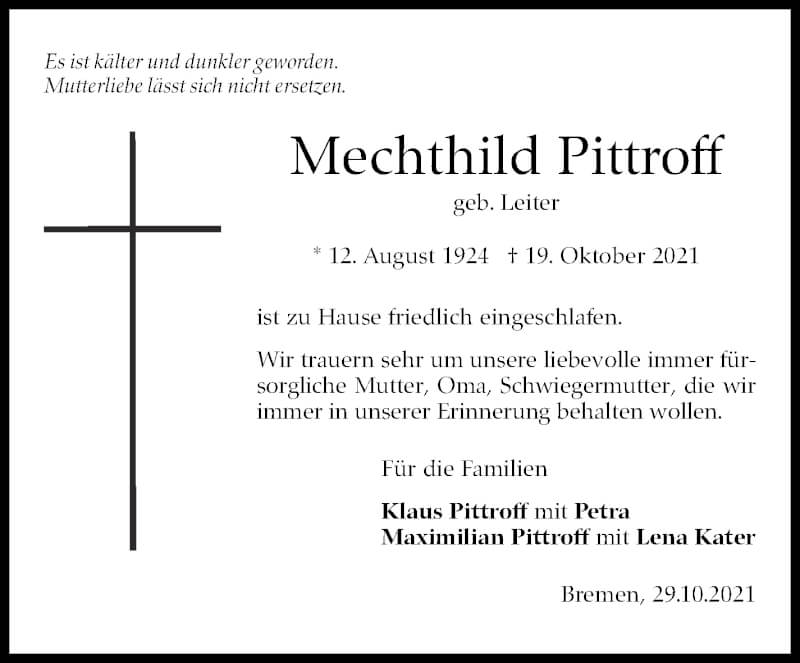 Hier finden Sie alle Traueranzeigen aus der Zeitung, die bisher für Mechthild Pittroff erschienen sind. Weitere Traueranzeigen, die in der Zeitung erscheinen, werden hier ebenfalls aufgelistet