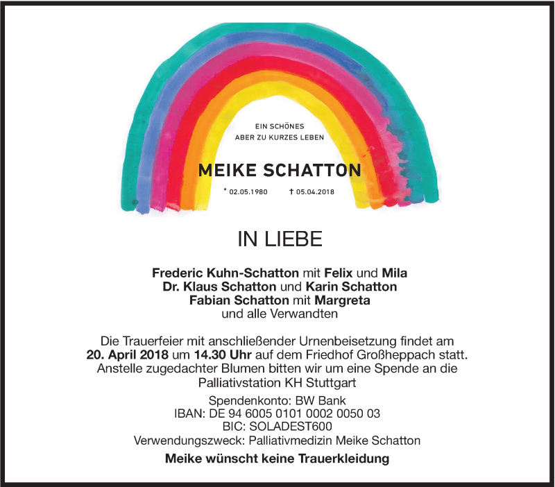 Hier finden Sie alle Traueranzeigen aus der Zeitung, die bisher für Meike Schatton erschienen sind. Weitere Traueranzeigen, die in der Zeitung erscheinen, werden hier ebenfalls aufgelistet