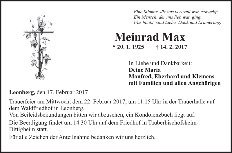 Hier finden Sie alle Traueranzeigen aus der Zeitung, die bisher für Meinrad Max erschienen sind. Weitere Traueranzeigen, die in der Zeitung erscheinen, werden hier ebenfalls aufgelistet
