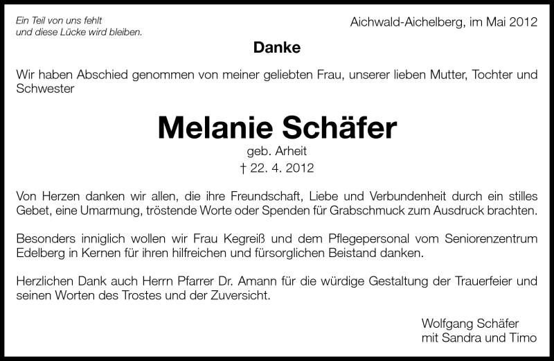 Hier finden Sie alle Traueranzeigen aus der Zeitung, die bisher für Melanie Schäfer erschienen sind. Weitere Traueranzeigen, die in der Zeitung erscheinen, werden hier ebenfalls aufgelistet