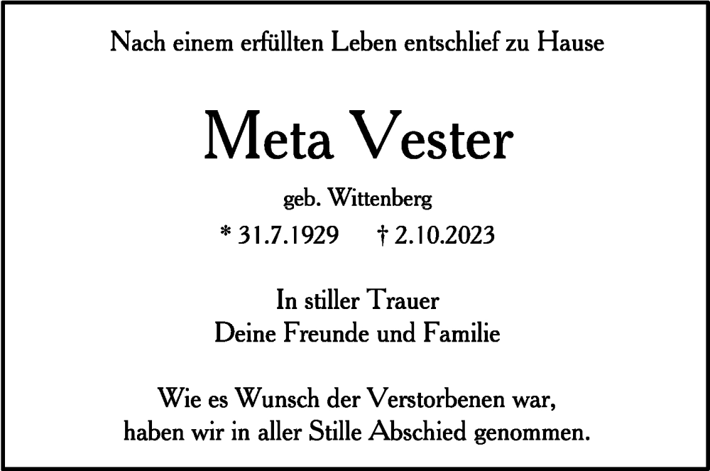 Hier finden Sie alle Traueranzeigen aus der Zeitung, die bisher für Meta Vester erschienen sind. Weitere Traueranzeigen, die in der Zeitung erscheinen, werden hier ebenfalls aufgelistet