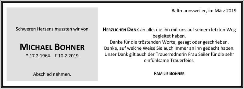 Hier finden Sie alle Traueranzeigen aus der Zeitung, die bisher für Miachael Bohner erschienen sind. Weitere Traueranzeigen, die in der Zeitung erscheinen, werden hier ebenfalls aufgelistet