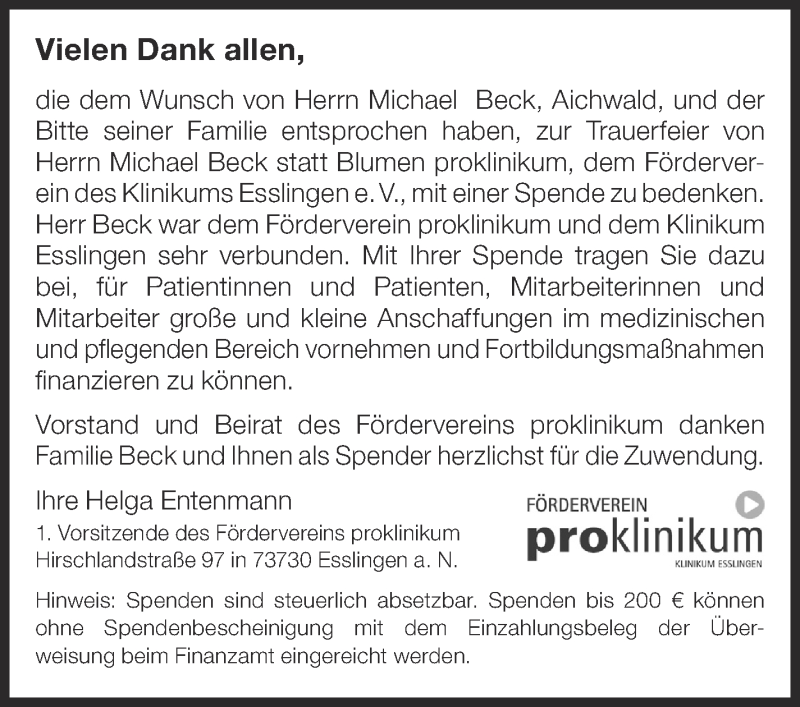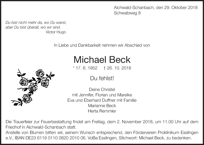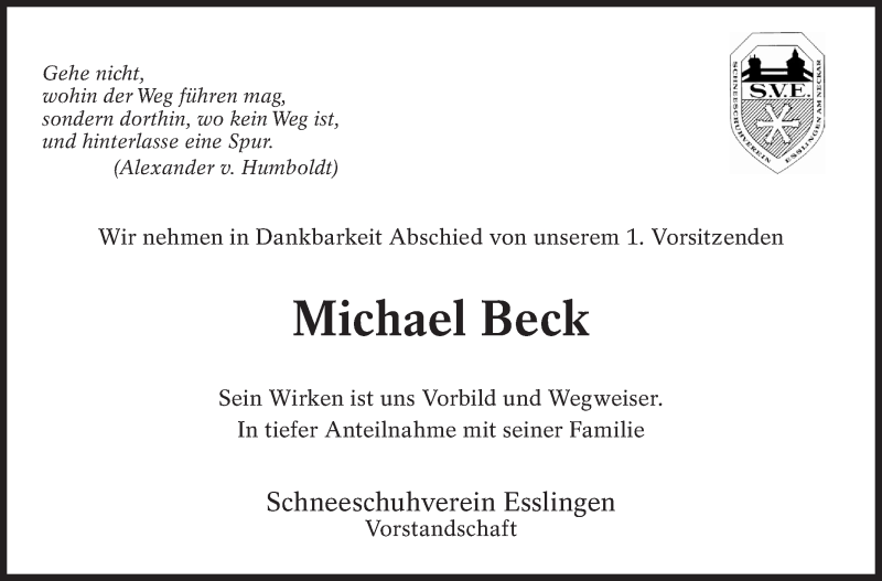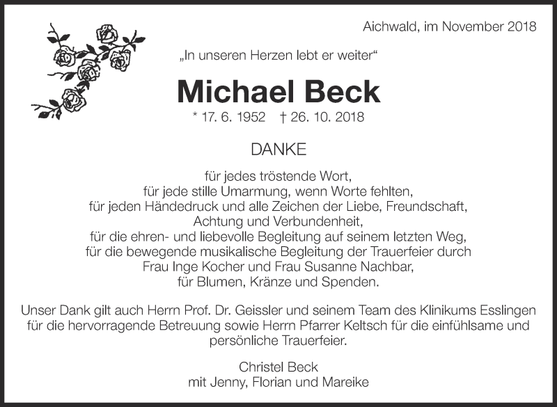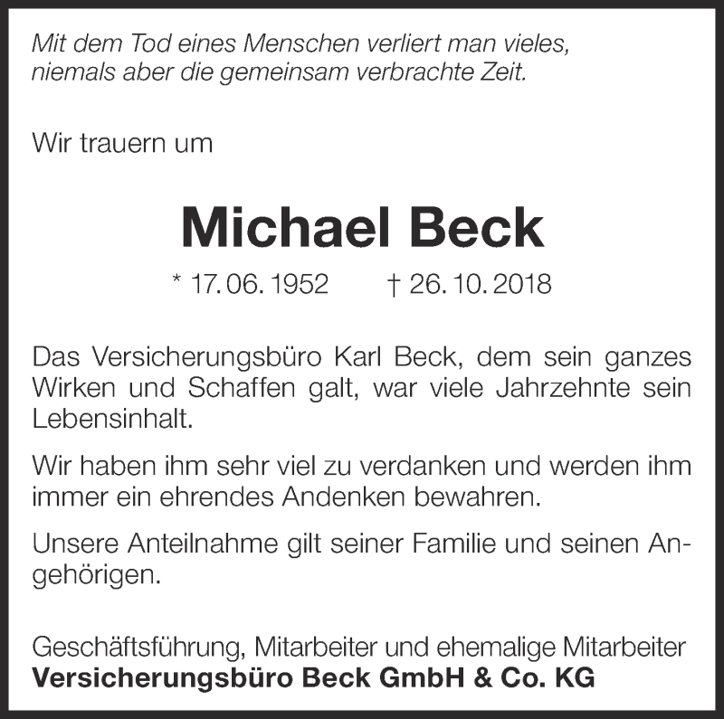 Hier finden Sie alle Traueranzeigen aus der Zeitung, die bisher für Michael Beck erschienen sind. Weitere Traueranzeigen, die in der Zeitung erscheinen, werden hier ebenfalls aufgelistet