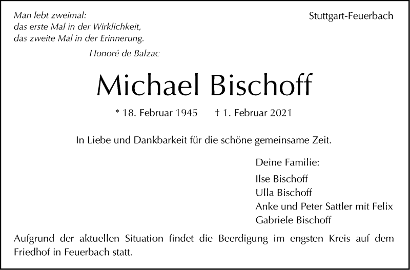 Hier finden Sie alle Traueranzeigen aus der Zeitung, die bisher für Michael Bischoff erschienen sind. Weitere Traueranzeigen, die in der Zeitung erscheinen, werden hier ebenfalls aufgelistet