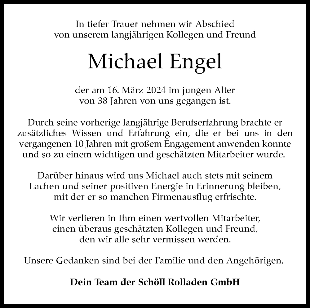 Hier finden Sie alle Traueranzeigen aus der Zeitung, die bisher für Michael Engel erschienen sind. Weitere Traueranzeigen, die in der Zeitung erscheinen, werden hier ebenfalls aufgelistet