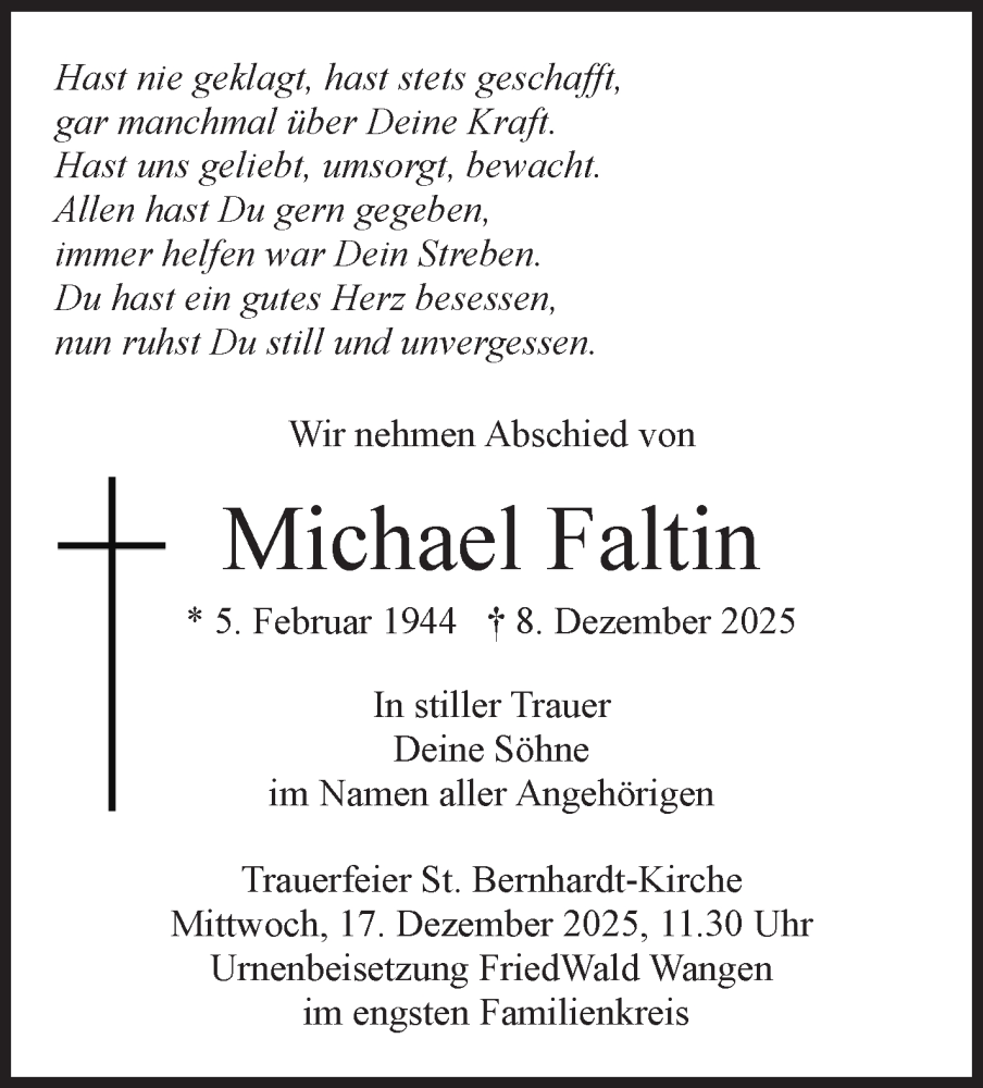 Hier finden Sie alle Traueranzeigen aus der Zeitung, die bisher für Michael Faltin erschienen sind. Weitere Traueranzeigen, die in der Zeitung erscheinen, werden hier ebenfalls aufgelistet